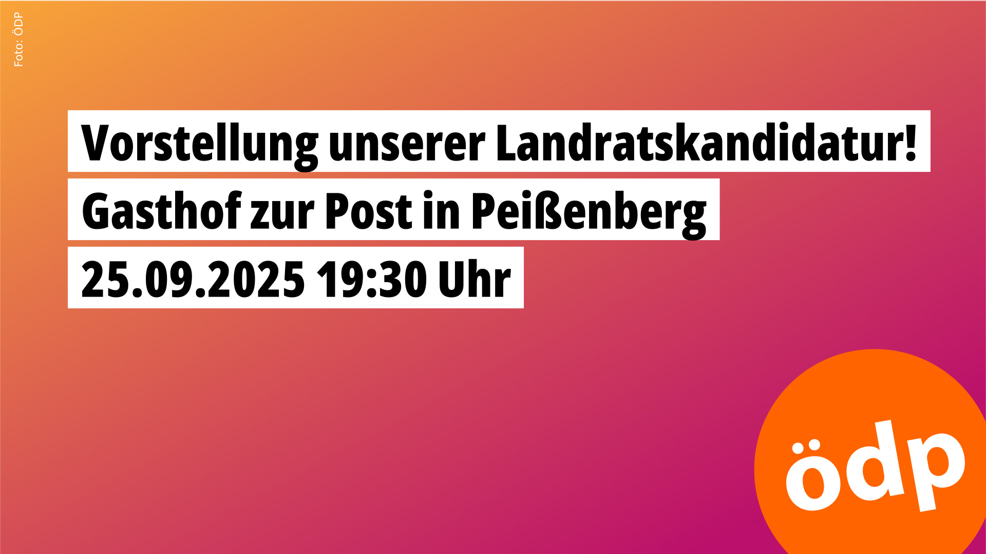 Die Ökologisch-Demokratische Partei (ÖDP) im Landkreis Weilheim-Schongau lädt herzlich zur öffentlichen Vorstellung ihrer Landratskandidatur ein. Die Veranstaltung findet am Donnerstag, den 25. September 2025 um 19:30 Uhr im Gasthof zur Post, Hauptstraße 19, 82380 Peißenberg statt. Im Rahmen der Veranstaltung wird die ÖDP ihren Landratskandidaten bzw. ihre Landratskandidatin für die Kommunalwahl 2026 präsentieren und die politischen Schwerpunkte für den Landkreis vorstellen. Dabei stehen zentrale Themen wie Wachstumskritik, Natur- und Artenschutz, Bürgerbeteiligung sowie der Einsatz für eine klimafreundliche, enkeltaugliche Kommunalpolitik im Fokus.